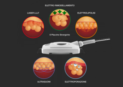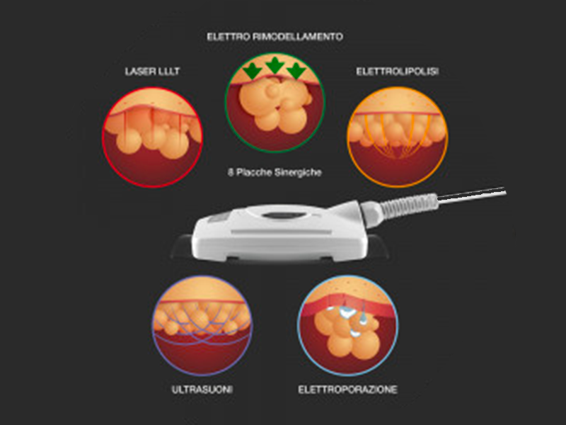 Infra Laser 980 grazie ad una serie di tecnologie di ultima generazione: come Low Level Laser (LLLT), Ultrasuoni, Elettrolipolisi, Elettro Rimodellamento ed Elettroporazione, tramite le 8 placche concave che si adattano perfettamente al corpo, agisce in profondità ed efficacemente sugli accumuli adiposi localizzati, sulla lipodistrofia cellulitica, sulla ritenzione dei liquidi e sull’atonia cutanea attraverso 4 differenti “percorsi” suddivisi in 16 programmi specifici, che consentono una visibile riduzione del tessuto adiposo e degli inestetismi della cellulite con un’eccellente tonificazione muscolare e rassodamento cutaneo.
